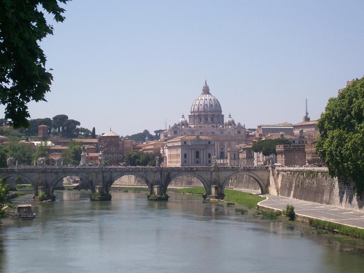 The Vittorio Emanuele Bridge over the Tiber River in Rome with Vatican City in the background. The bridge was completed in 1911.