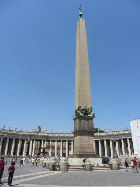 An Egyptian obelisk in Saint Peter's Square in Rome. Composed of red granite, the obelisk is 25.5 m tall (41 m to top of cross). It was transferred to Rome by the Emperor Caligula in A.D. 37, and moved to its current location at the direction of Pope Sixtus V in 1586. It is the only Egyptian obelisk in Rome never to have fallen.