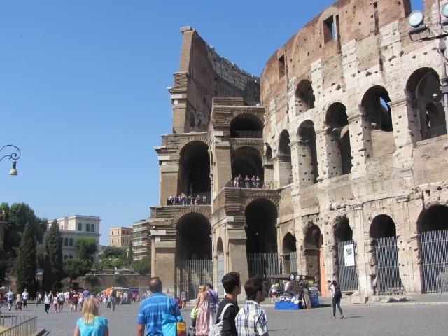 The Colosseum in Rome was first used in A.D. 80. In Roman times, it was called the Flavian Amphitheater and held 50,000 spectators. The name "Colosseum" was introduce in medieval times and referred to a giant statue of Nero that stood nearby. The outer walls have three levels of arches with columns topped by Ionic capitals at the lower level and Doric and Corinthian at the top. The 80 entrance/exit arches, known as vomitoria, allowed spectators easy access and the ability to clear the building in minutes.
