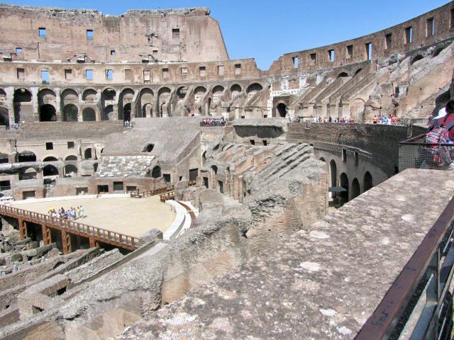The Colosseum in Rome showing the interior with a partial reconstruction of the wooden arena floor. The rooms and passageways under the floor were used for performers, sets, and animals. The arena could be flooded to recreate sea battles.