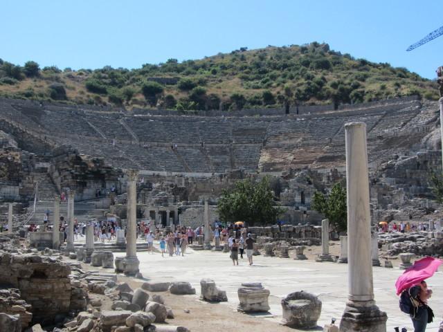 {"ops":[{"insert":"The "},{"attributes":{"bold":true},"insert":"Great Theater"},{"insert":" in "},{"attributes":{"bold":true},"insert":"Ephesus "},{"insert":"was based on an original Greek structure. In the Roman period, it was expanded under the reigns of Domitian (A.D. 81 to 96) and Trajan (98 to 117). One estimate gives the theater's capacity as "},{"attributes":{"bold":true},"insert":"44,000 spectators"},{"insert":" and as such it would have been the "},{"attributes":{"bold":true},"insert":"largest in the ancient world"},{"insert":". While generally used for theatrical performances and public assemblies, it was also used for gladiatorial contests in the later imperial period.\n"}]}